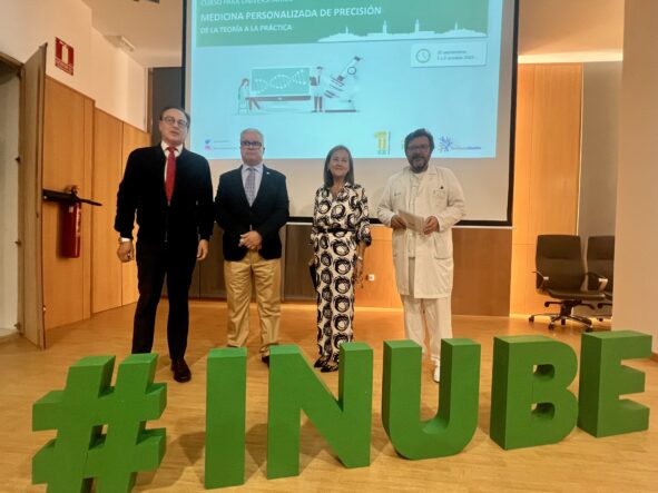30/09/2025. El Salón Guadiana del Hospital Universitario de Badajoz ha acogido esta tarde la inauguración del curso universitario “Medicina Personalizada de Precisión: de la teoría a la práctica”, impulsado por el Instituto Universitario de Biomedicina de la UEx (INUBE) con la colaboración de la Fundación Instituto Roche. La apertura ha contado con la presencia del rector de la Universidad de Extremadura, Pedro M. Fernández Salguero, el gerente del Complejo Hospitalario Universitario de Badajoz, Demetrio Pérez Civantos, el director científico de INUBE, Adrián Llerena, y la directora gerente de la Fundación Instituto Roche, Consuelo Martín de Dios.