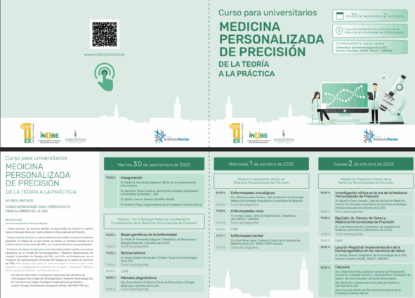 Además de las ponencias de profesorado universitario y especialistas clínicos, los alumnos tendrán la posibilidad de realizar prácticas en la Unidad de Farmacogenética y Medicina Personalizada del Hospital Universitario de Badajoz. Esta experiencia permitirá conocer de cerca el Programa de Implementación Clínica del SES basado en la Cartera de Servicios del Sistema Nacional de Salud, un referente en la integración de la farmacogenómica en la práctica médica.