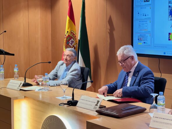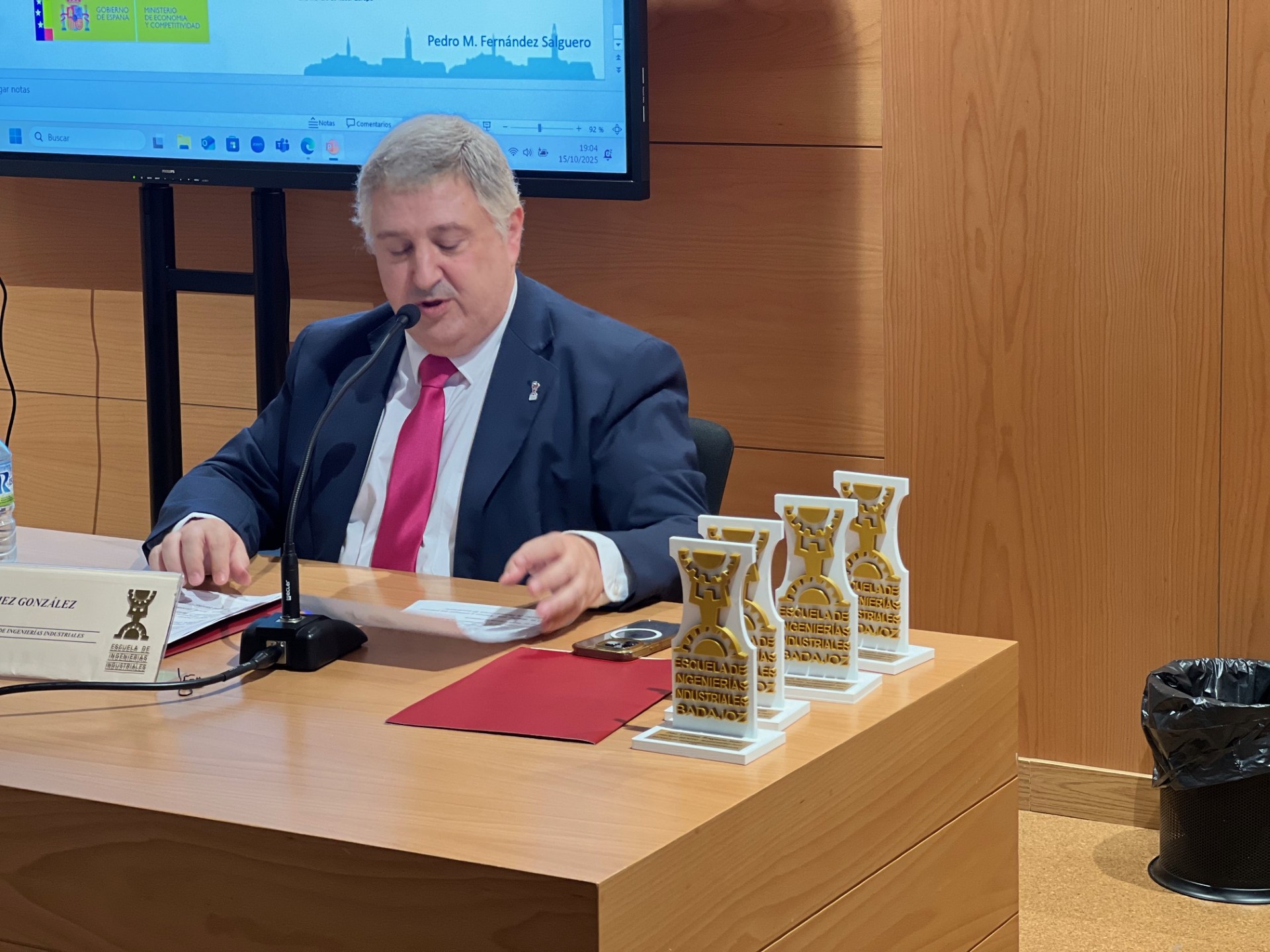 Uno de los momentos más emotivos del acto llegó con la intervención del antiguo director de la Escuela, José María Sánchez-Marín Pizarro, quien realizó un sentido recorrido por su trayectoria en la Escuela, recordando su llegada al centro y la etapa del traslado a las nuevas instalaciones. Compartió además un testimonio personal sobre el fallecimiento de su hijo en 2010, y cómo actualmente se reúnen en una asociación los padres que han pasado por la misma situación. “Desde entonces nos reunimos semanalmente en la antigua Escuela de Industriales. Voy todos los martes a la Escuela: me siento en mi casa”, relató con emoción. “Y a los propios asociados les digo con orgullo que nuestra antigua Escuela está siendo utilizada de una manera adecuada y exitosa. Me alegra ver cómo sigue viva, acogiendo proyectos y personas que mantienen su espíritu.” Sus palabras fueron recibidas con un largo aplauso, reflejo del respeto y cariño de toda la comunidad universitaria hacia quien fue uno de los impulsores del crecimiento y prestigio de la Escuela.