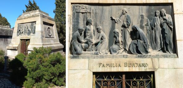 En el camposanto de Cáceres el investigador señala el panteón de la familia Berjano. Es una hermética y potente estructura troncopiramidal, que simbólicamente afianza la idea de solidez y estabilidad, con un valioso relieve en bronce del catalán Josep Llimona, aclara el profesor.