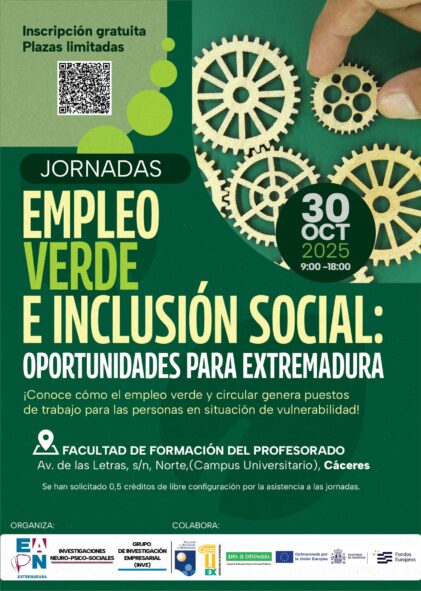 La jornada, que se desarrollará de 9:00 a 18:00 horas en el Salón de Actos de la Facultad, está organizada por los grupos de investigación Neuro-Psico-Sociales, Investigación Empresarial e INPEX, con la colaboración de la Red Europea contra la Pobreza y la Exclusión Social (EAPN Extremadura) y la Facultad de Formación del Profesorado. El evento cuenta con financiación de la Junta de Extremadura y el Ministerio de Hacienda, en el marco de los Fondos Europeos Next Generation. La inscripción es gratuita y se ha solicitado el reconocimiento de 0,5 créditos de libre configuración por la asistencia.