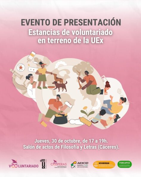 29/10/2025. La Oficina Universitaria de Cooperación y Acción Solidaria de la Universidad de Extremadura presenta las experiencias de voluntariado en terreno este jueves, 30 de octubre, de 17:00 a 19:00 horas en el salón de actos de la Facultad de Filosofía y Letras de Cáceres.