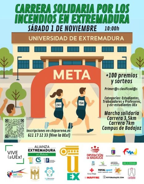 29/10/2025. La Universidad de Extremadura, a través del programa Vive la UEx, y en colaboración con el Consejo de Estudiantes, SAFYDE, Alianza Extremadura es Futuro, el Consejo Social de la UEx y la Fundación Universidad-Sociedad de la UEx , organiza este sábado 1 de noviembre la II Carrera Solidaria por los Incendios en Extremadura, una iniciativa que busca recaudar fondos destinados a la restauración de las zonas afectadas por los incendios forestales en la región.
