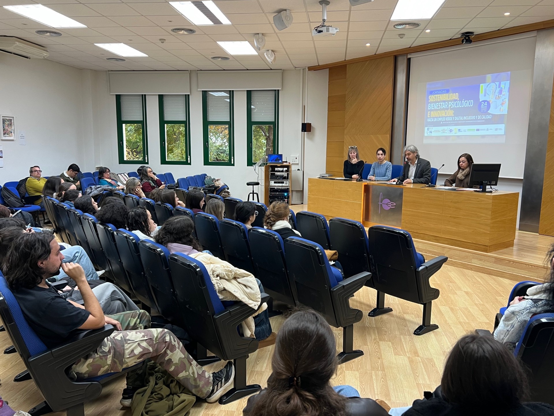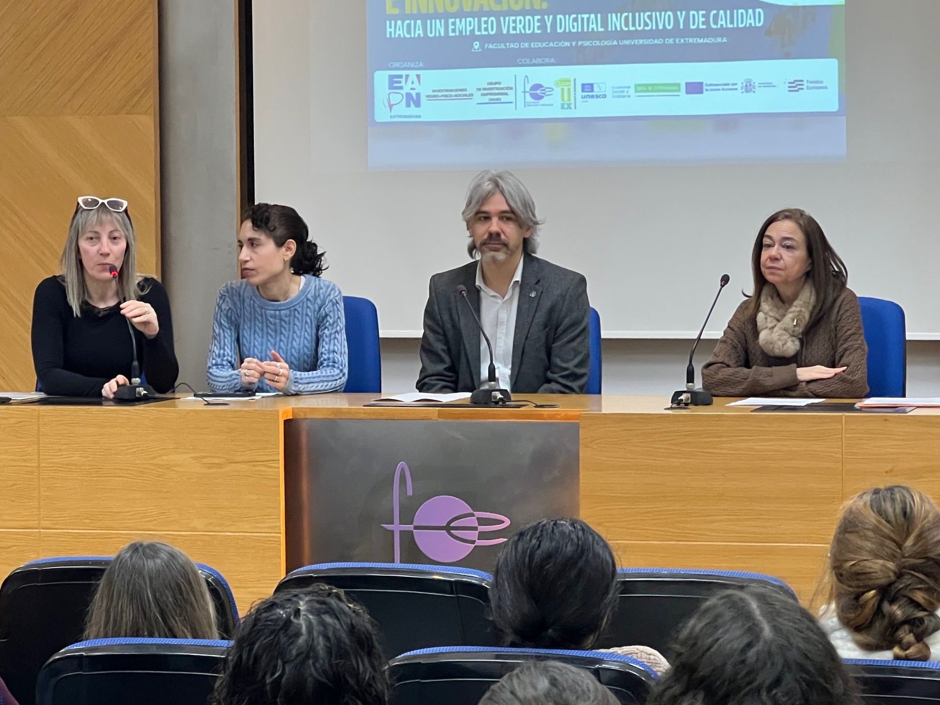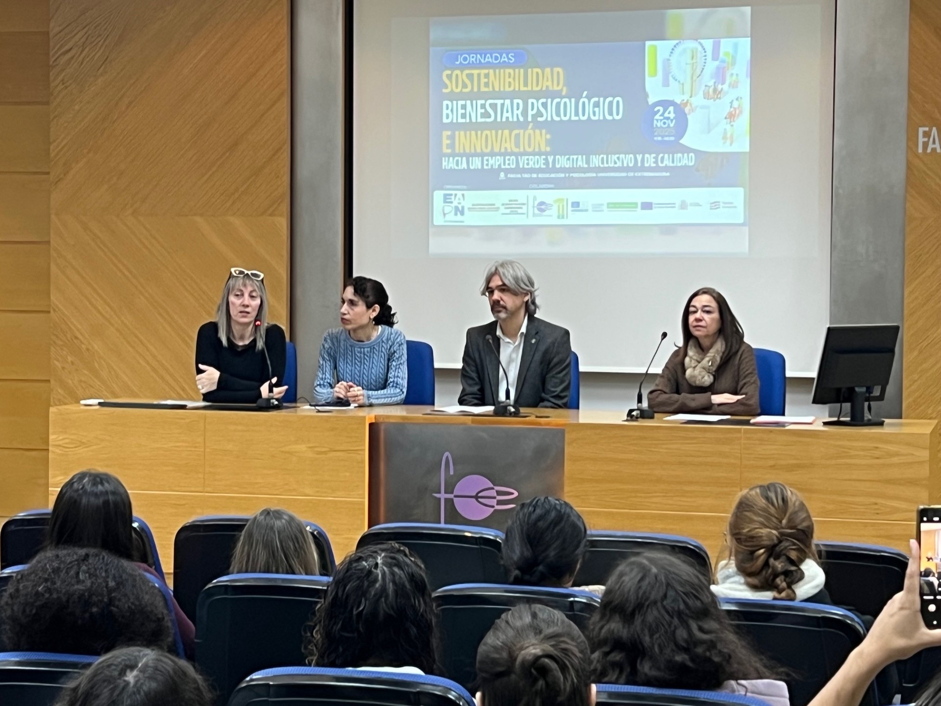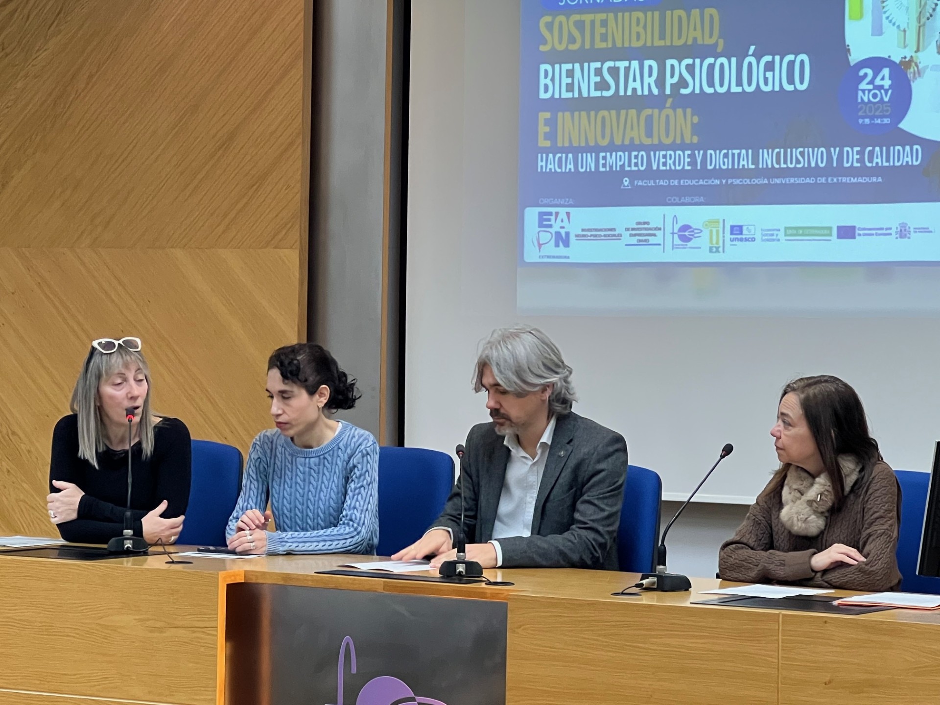 24/11/2025. La Facultad de Educación y Psicología de la Universidad de Extremadura ha inaugurado esta mañana las jornadas “Sostenibilidad, Bienestar Psicológico e Innovación: hacia un empleo verde y digital inclusivo y de calidad”, un encuentro impulsado por el Grupo de Investigaciones Neuro-Psico-Sociales en colaboración con EAPN Extremadura. La cita reúne a especialistas de diversos ámbitos para reflexionar sobre los retos y oportunidades de la transición ecológica y digital en el empleo.